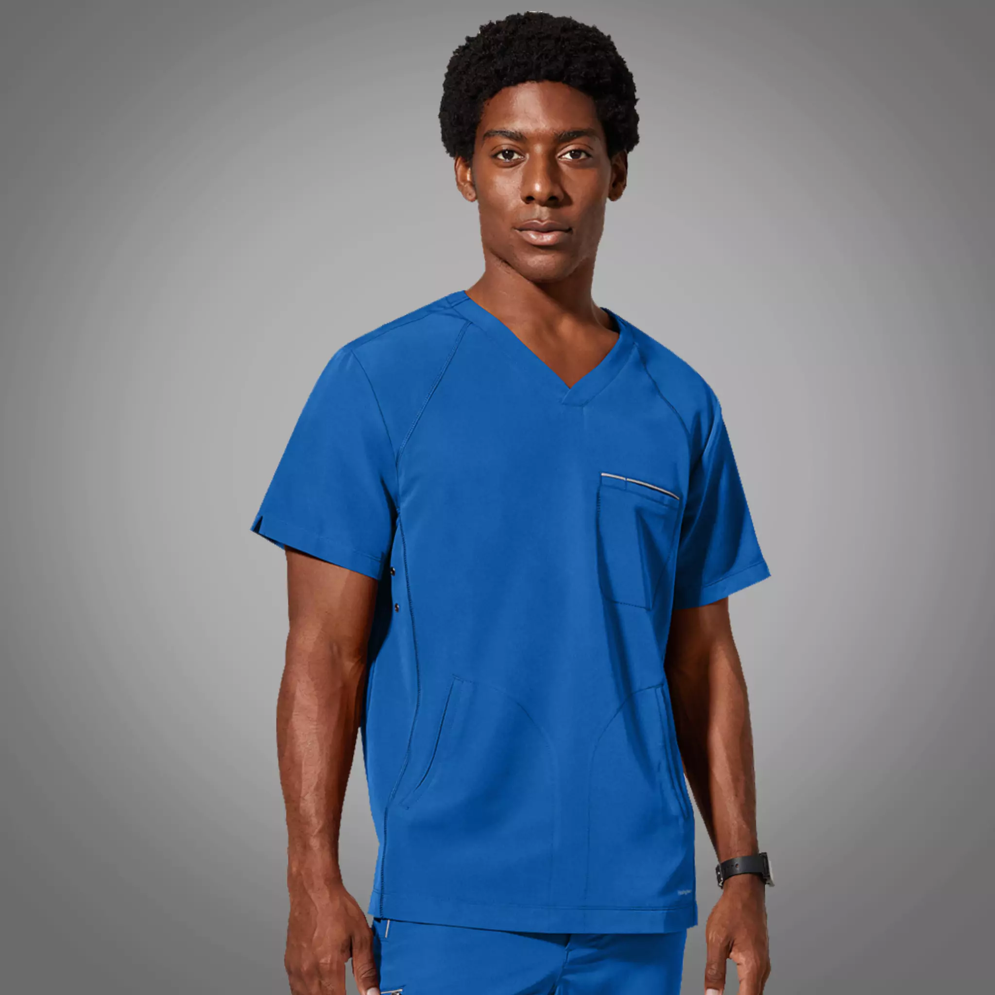 With a subtle reflective trim and sporty seamed details, the 360 by Healing Hands Mens Steven V-Neck Scrub Top is sure to be a favorite. Made with sustainability in mind, it features three pockets for your gear.