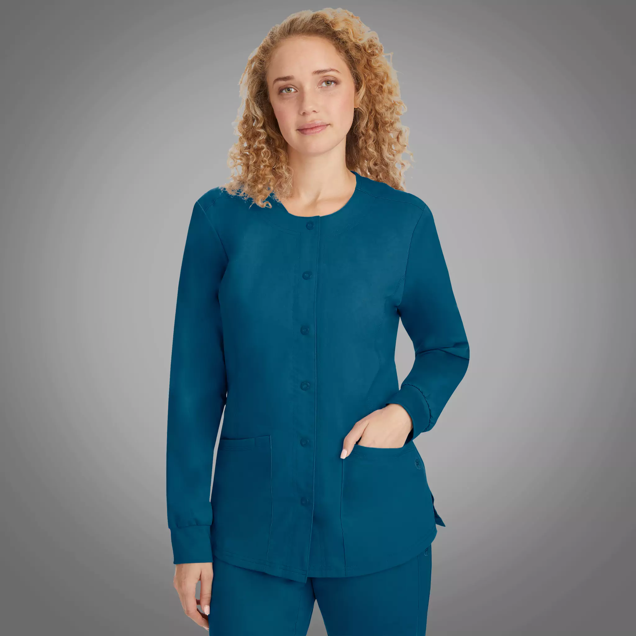 Hospitals, offices, and clinics are always so cold - so get a Daisy Jacket to add to your scrub collection! Available in a wide range of colors to match your scrub set, the Daisy Jacket has a crew neck and snaps down the front. It also features a divided pocket space and a dedicated phone pocket to keep you organized. Round Neck Jacket 4 Pockets Including?