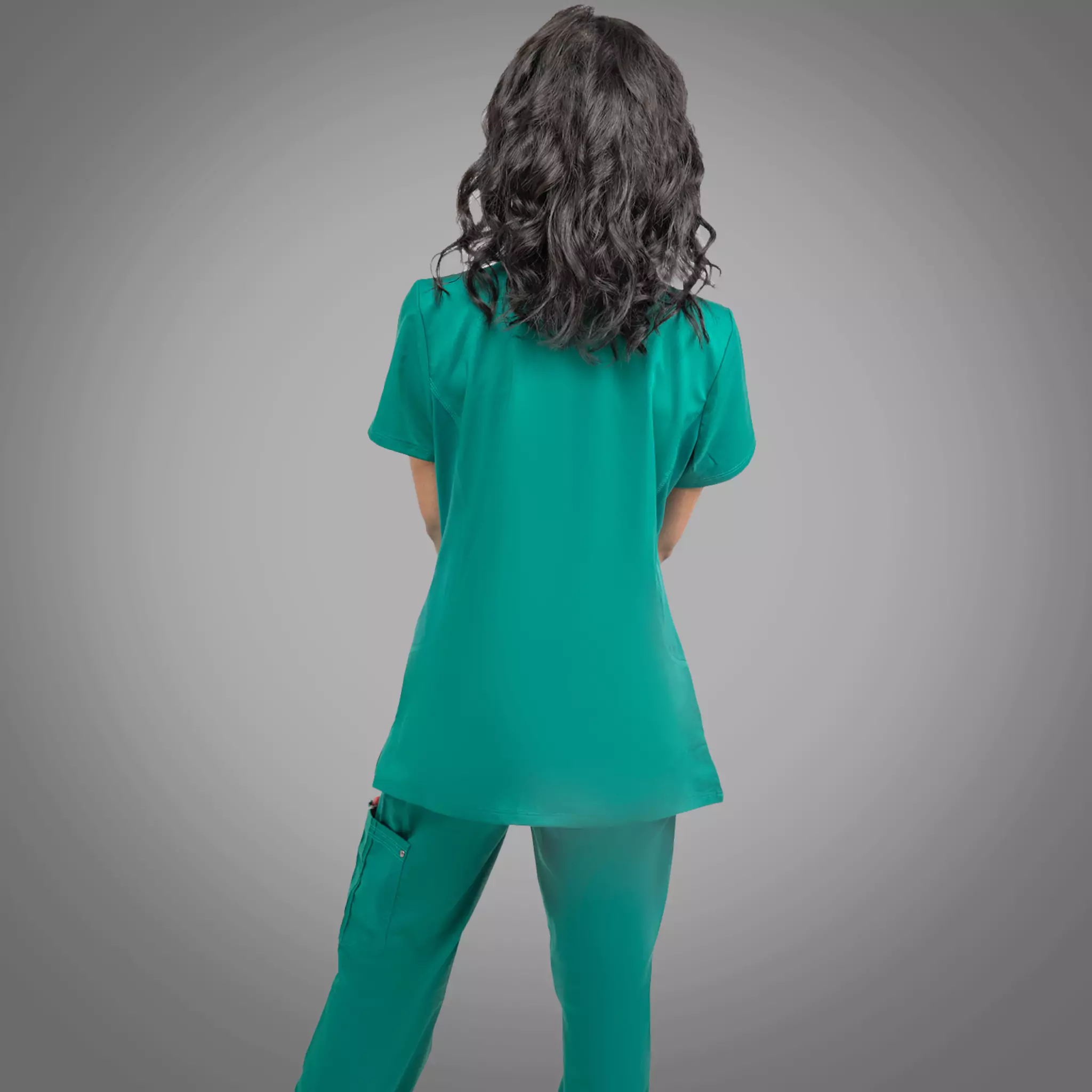 This modern fit Juliet top has a v-neck, accented with knit trim and side stretch panels. The front and back princess seaming allows for a superior fit. For storage, youll find 2 front patch pockets with tonal grosgrain ribbon and rivet detail. In addition, there are bust darts and a curved hem. Side slits provide ease of movement.